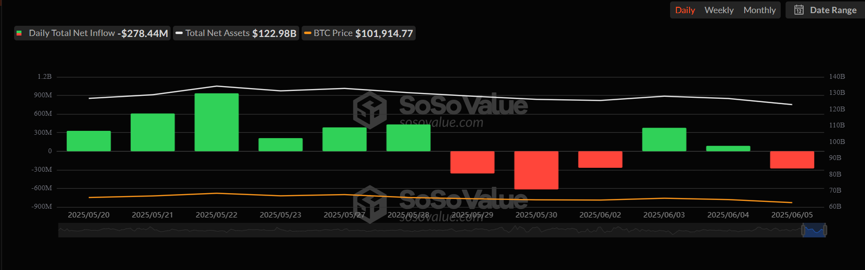 On Thursday, Bitcoin spot ETFs recorded net outflows of $278.44 million. The capital exit extends the decline in bullish sentiment, beginning with a 77% drop in net inflows the previous day.