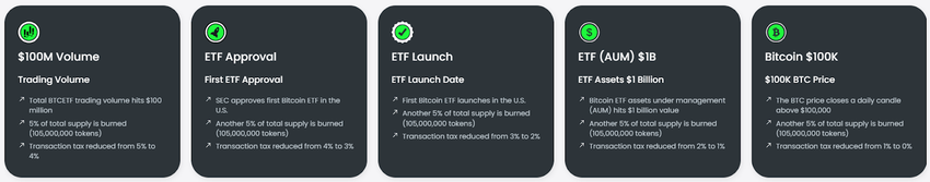 Sponsored SponsoredThe project similarly employs a dynamic 5% transaction tax on all trades, which declines 1% each time an ETF goal occurs – until the tax reaches 0% once all targets complete. This sliding tax rewards early BTCETF buyers who hold through the SEC approval process.