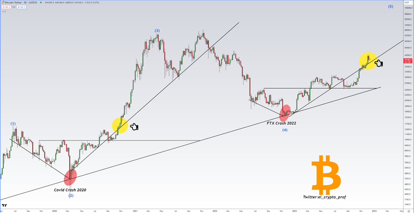 Veteran analyst Moustache recently updated his 85,000 X (Twitter) followers on Bitcoin’s price chart. He remains bullish on the long-term outlook despite the current retracement from 2023 highs: