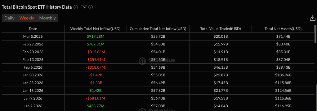 The reversal has been just as sharp. The week of Feb 27 brought $787 million in net inflows. The week of Mar 5 added another $917 million. Bloomberg Senior ETF Analyst Eric Balchunas said the year-to-date hole is now “almost closed.” Cumulative net inflows across all spot Bitcoin ETFs stood at $55.72 billion as of Mar 5 — down from $57.08 billion at the start of the year, but well off the lows.