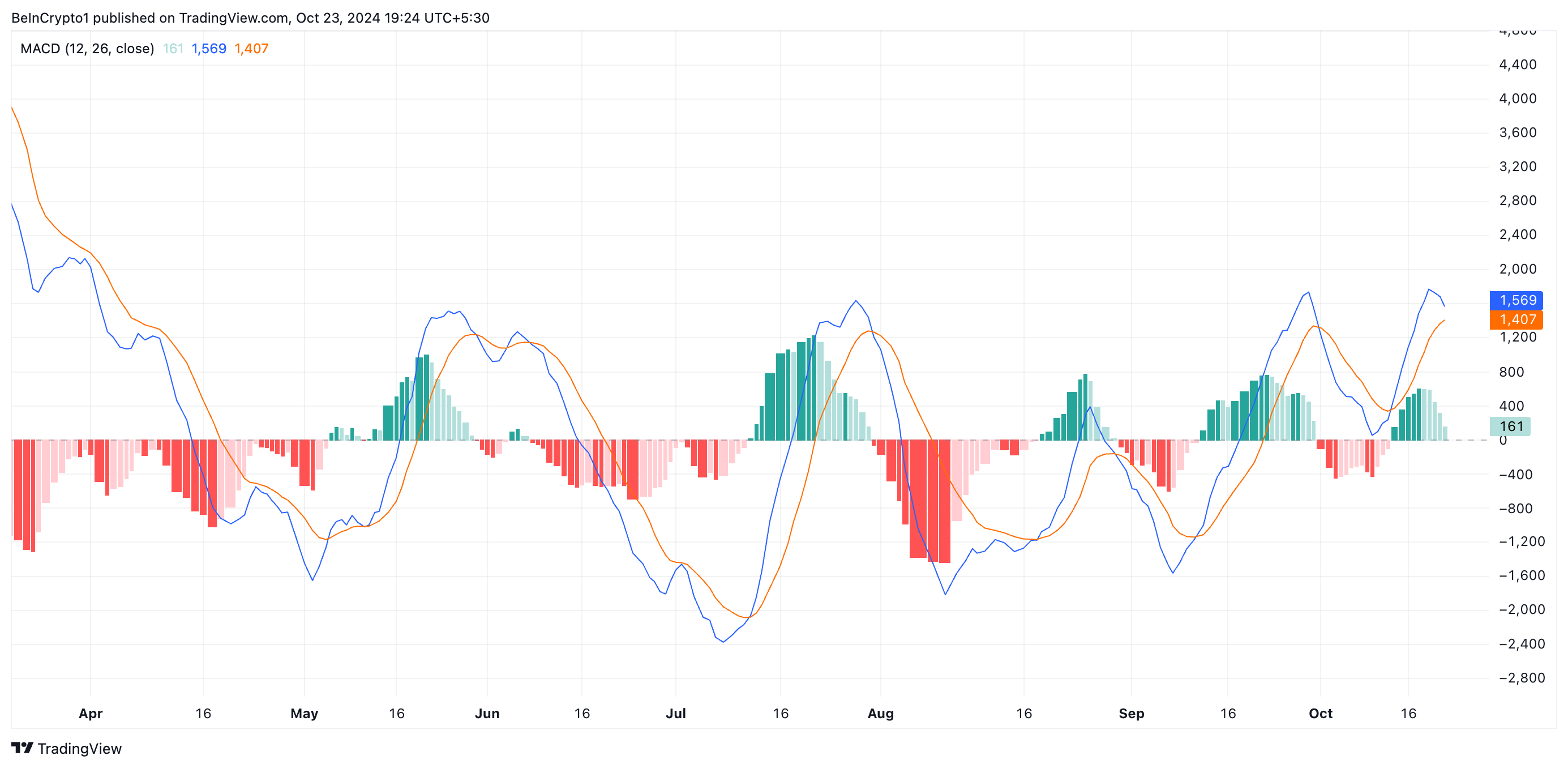 This indicator measures an asset’s price trends and momentum and identifies potential buy or sell signals. When set up this way, it confirms increased selling pressure in the market. The potential crossover suggests that the asset’s price momentum is weakening, and a downward trend or correction could follow.