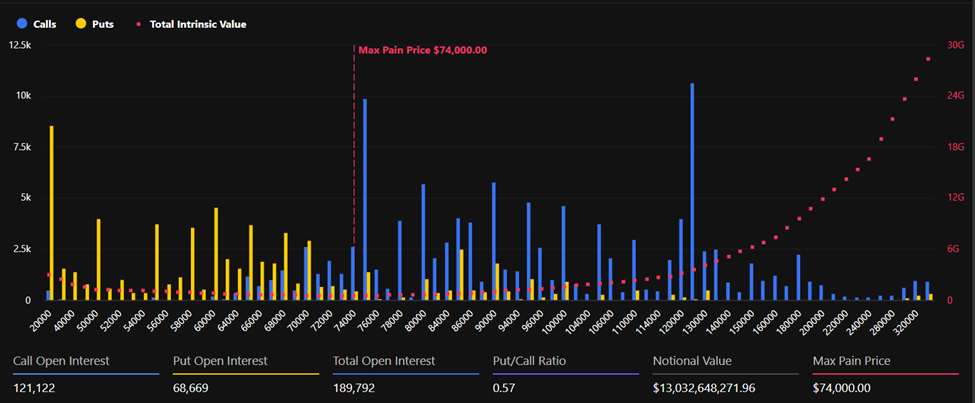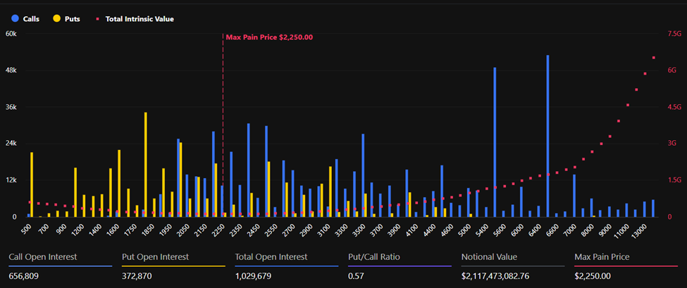 Bitcoin’s max pain sits at $74,000, while ETH’s max pain sits at $2,250. With BTC trading near $68,685 and ETH around $2,057, both assets remain significantly below these thresholds.
