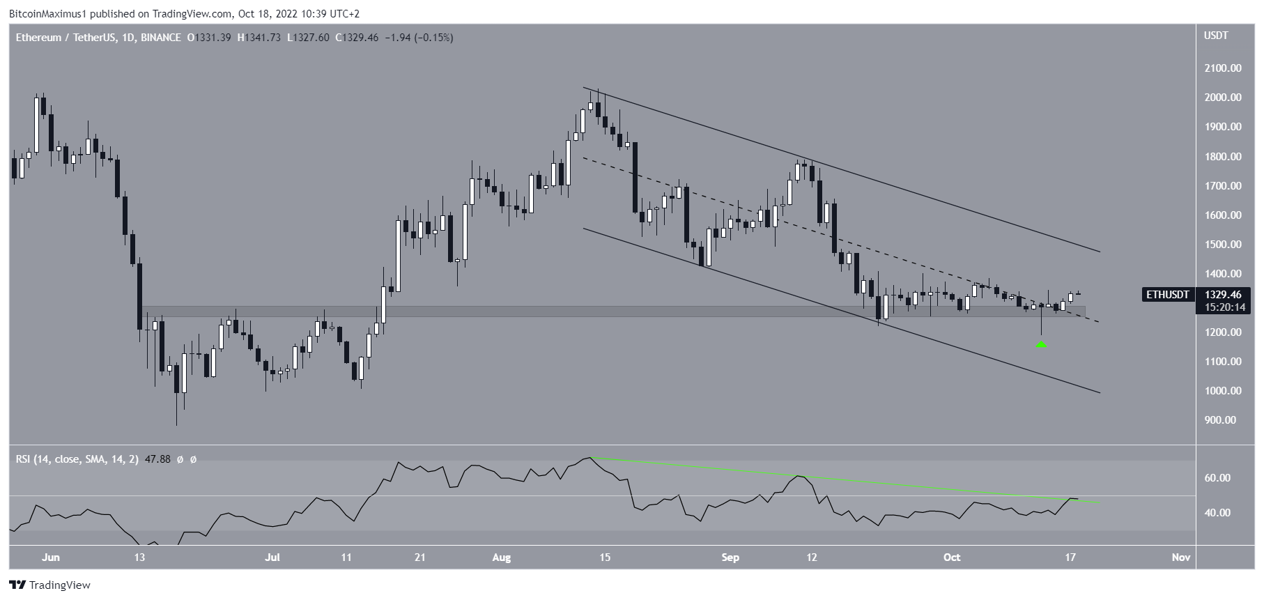 While decreasing inside it, the ETH price fell to a low of $1,190 on Oct. 13. While it initially seemed that this had caused a breakdown below the $1,280 horizontal support area, the Ethereum price reclaimed the area shortly afterward and created a long lower wick (green icon).