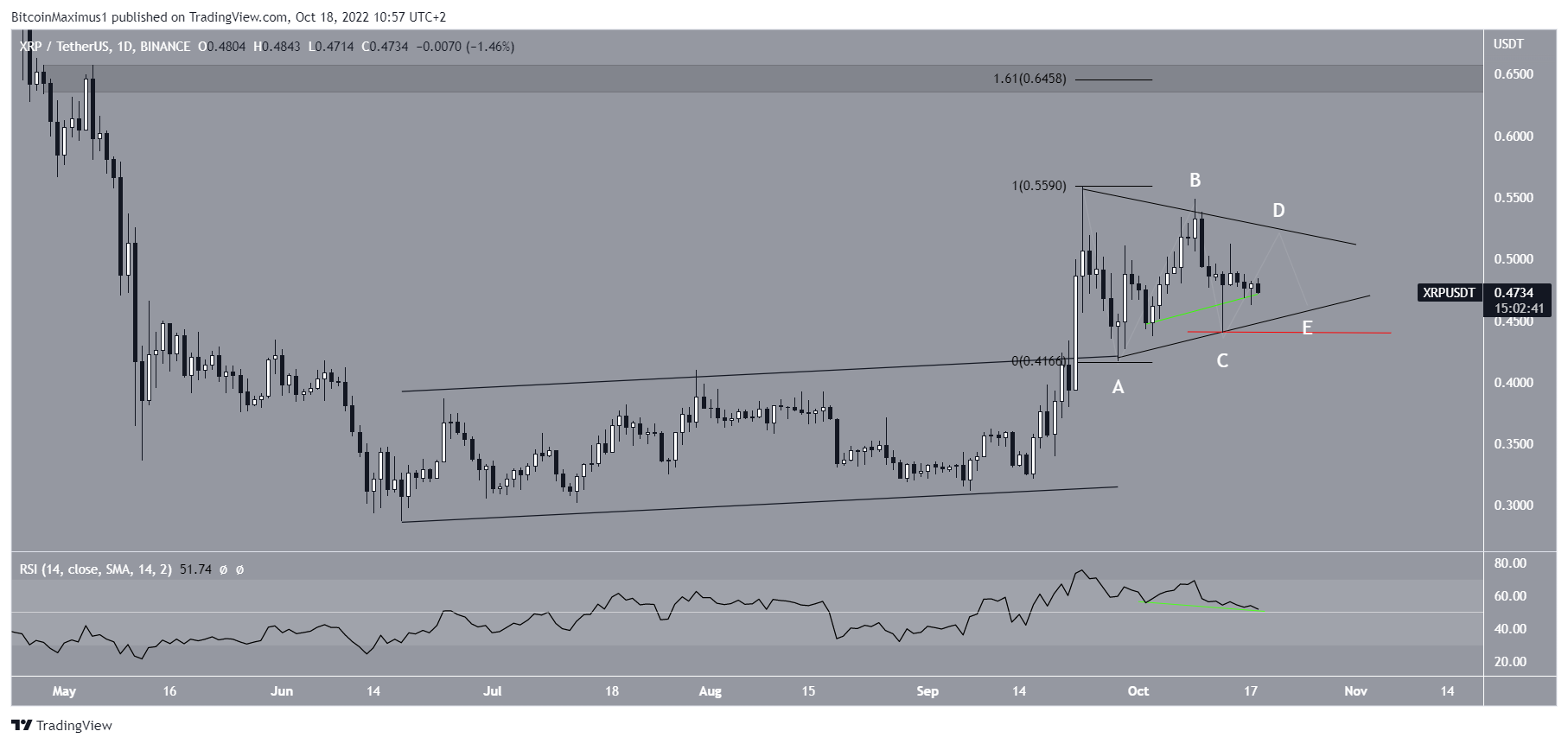 A decrease below the wave C low of $0.44 (red line) would invalidate this possibility and indicate that XRP price is correcting instead.