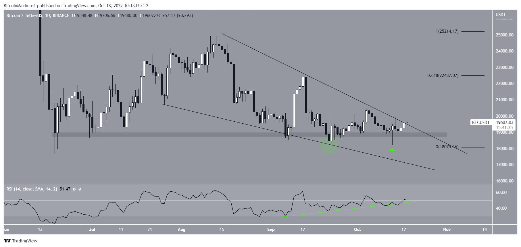 Moreover, the price of Bitcoin created a bullish hammer candlestick on Oct. 13 (green icon), further supporting the possibility of a breakout.