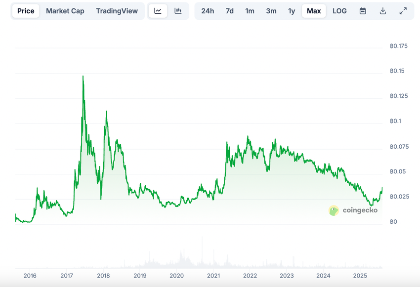 In the 2017 bull run, the ETH/BTC ratio was around 0.1475 BTC per ETH. This means ETH was worth about 14.75% of BTC’s price at its peak of the ratio.