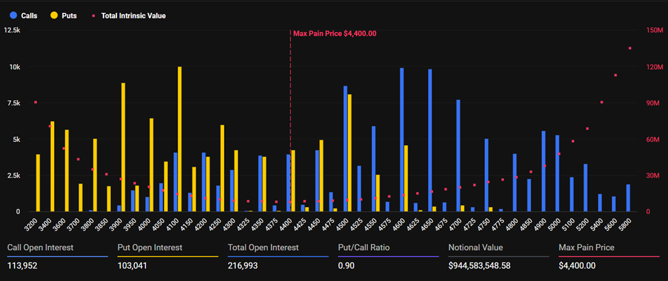 Today, at 8:00 UTC, $944.5 million in Ethereum options will expire on Deribit. Ethereum’s max pain is $4,400, and open interest is nearing 217,000.