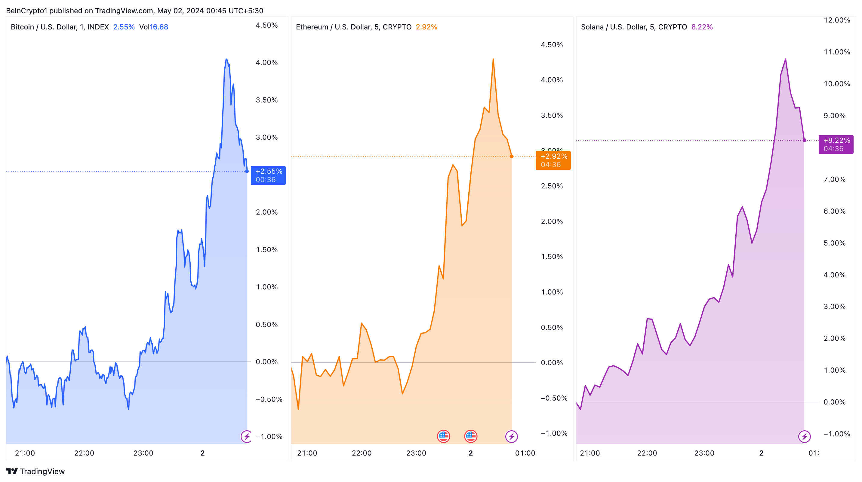 Bitcoin, Ethereum, and Solana saw a significant price increase, coinciding with Powell’s insights from the Federal Open Market Committee’s meeting.