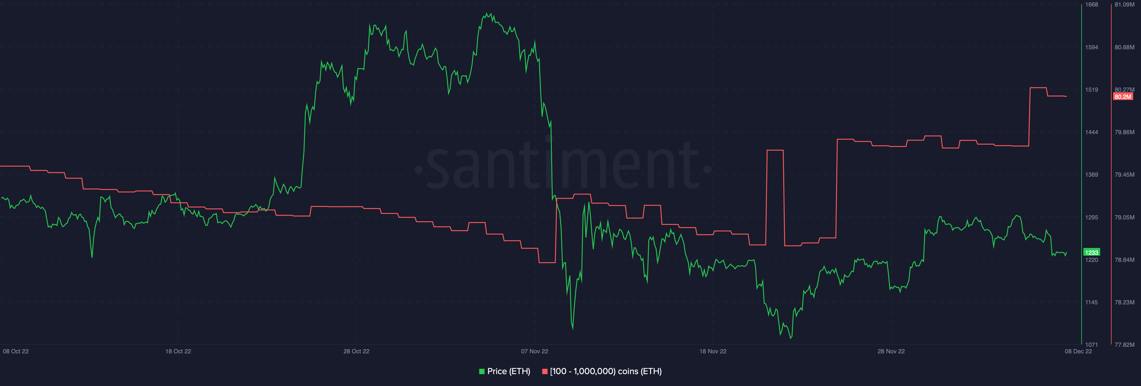 The ETH whales and sharks kept adding more ETH to their bags despite the price moving in a range bound trajectory. The key shark and whale addresses holding 100 to one million ETH own two-thirds of the coin’s overall supply.