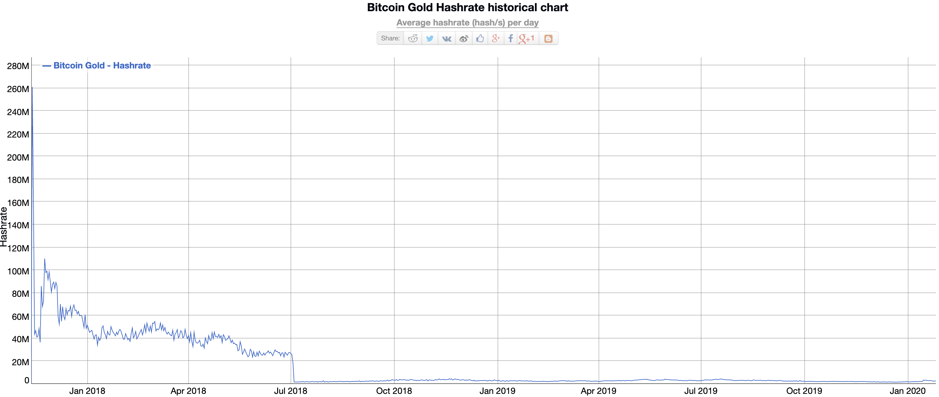 The latest attack on Bitcoin Gold (BTG) is not surprising given the networkās plummeting hash rate. Ever since July 2018, the Bitcoin hard forkās hash rate has dropped off to near-zero. The lack of security on the network has caused it to become maligned with 51% attacks, which will likely continue.