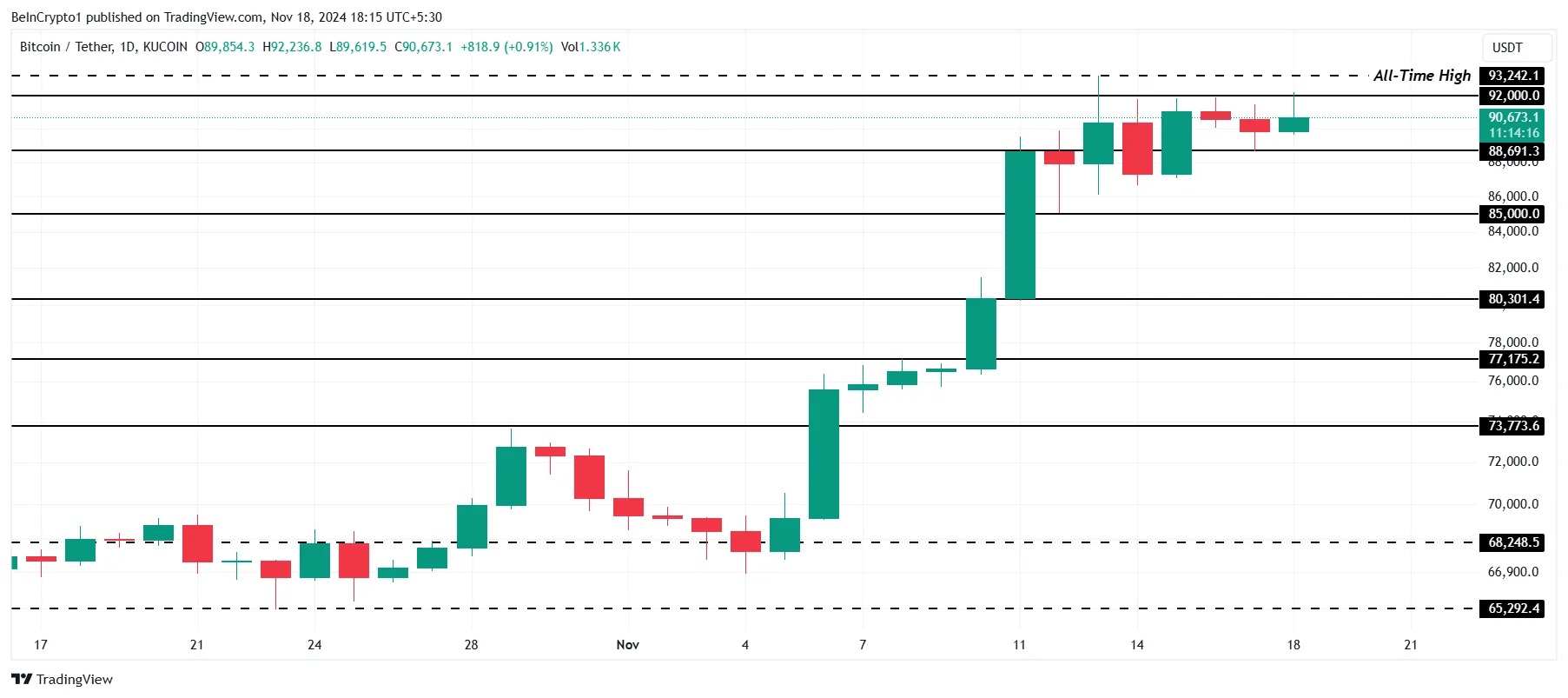 Conversely, a bounce off $88,691 and a successful breach of the $92,000 resistance could revive bullish momentum. This would allow Bitcoin to aim for a new ATH above $93,242, effectively invalidating concerns of a reversal and reinforcing its long-term upward trajectory.