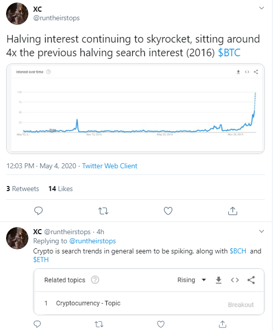 According to data from Google Trends pointed out by @runtheirstops on Twitter, search interest in the Bitcoin halving is now four times the level seen before the 2016 halving. Indeed, as previously reported by BeInCrypto, Bitcoin halving searches have been steadily climbing over the past few weeks.