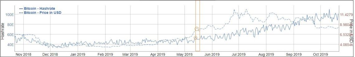 For example, in BitInfoChart’s above graph, it appears as though the sentiment in the mining community closely followed that in the investing community around the period of May-June 2019. As the price started on an upward trajectory, more hash power followed.