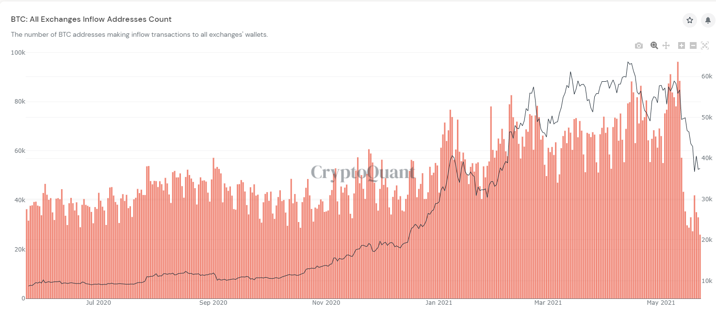 The number of BTC addresses making inflow transactions to exchange wallets has dropped to 25,000. The lowest seen in 2021. The previous daily high was set just over a week ago, with 96,000 inflow transactions. That record high was set the same day BTC hit a new all-time high.Â
