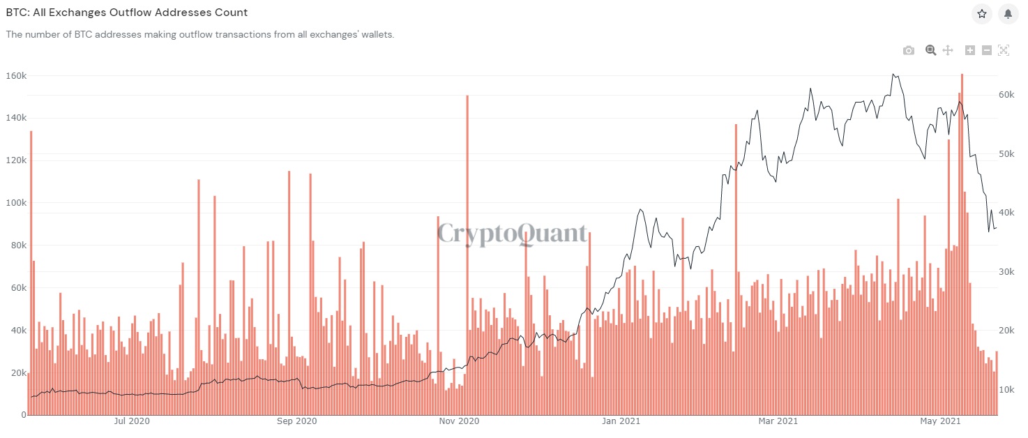 The number of BTC addresses making outflow transactions from all exchanges has also seen a major drop in activity. Crypto Quant shows that over 30,000 transactions were done on May 22. This is down from the recent high set on May 10, which saw over 160,000 addresses making outflow transactions.Â