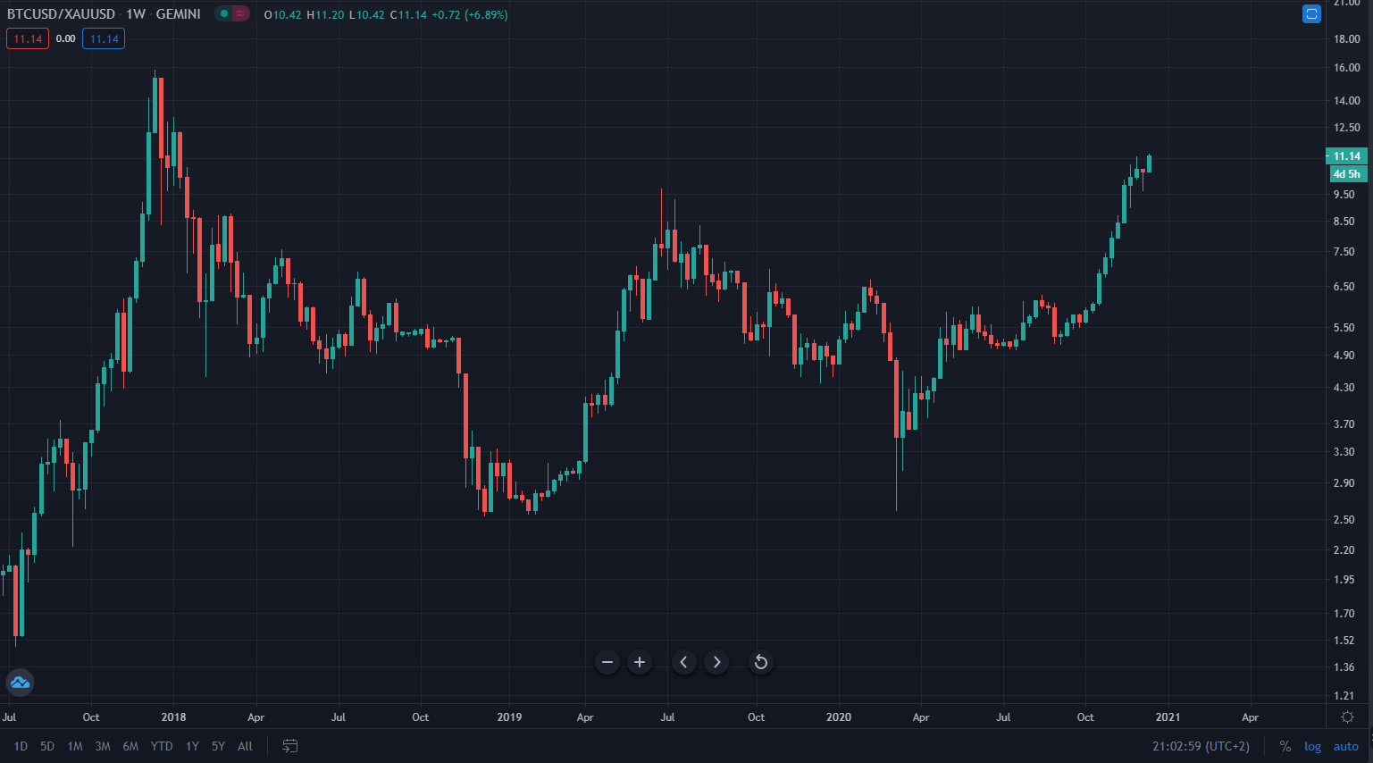 Bitcoin is powering ahead into the $20,000 a coin range, and gold looks to be in trouble. According to the latest ratio chart, it now costs just over 11 ounces of gold per one BTC: