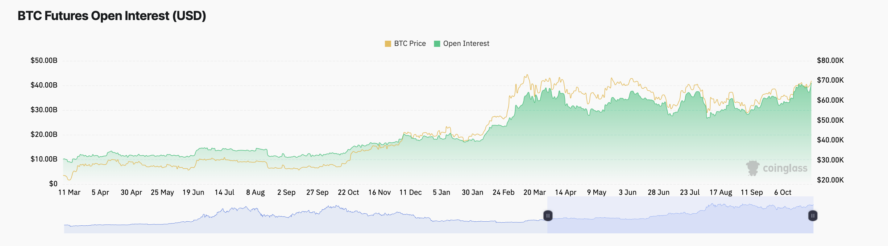 Bitcoin’s price hike has been accompanied by a corresponding surge in its open interest. At $44.44 billion as of this writing, the coin’s open interest has noted a 10% rally in the past 24 hours and currently sits at a new all-time high.
