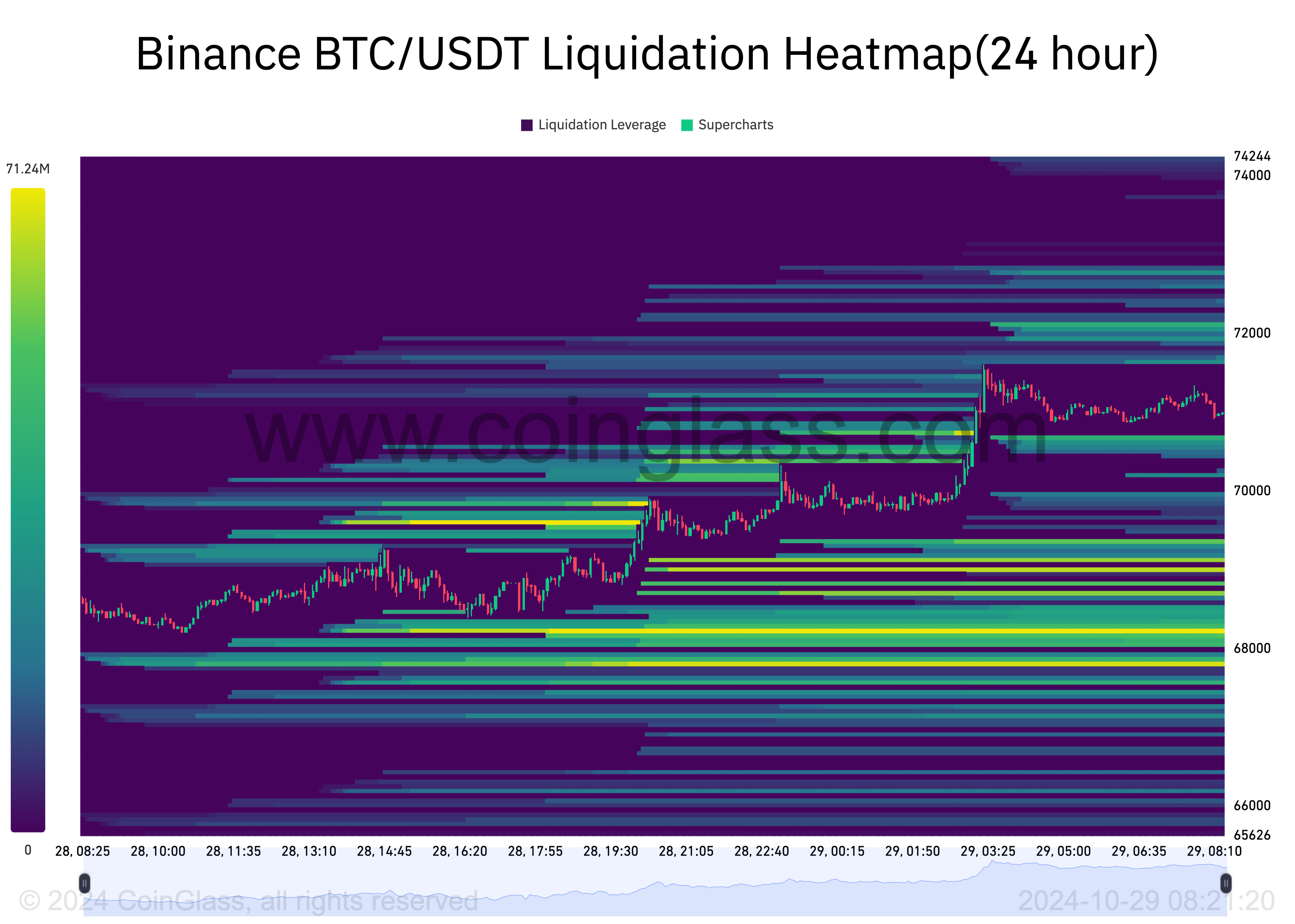 On the other hand, a pullback to this price range could also result in a buying frenzy. If the buying pressure is strong enough, Bitcoin’s price could break above its recent highs and continue its upward trend, attempt to breach resistance at $71,726, and aim for the all-time high of $73,777.