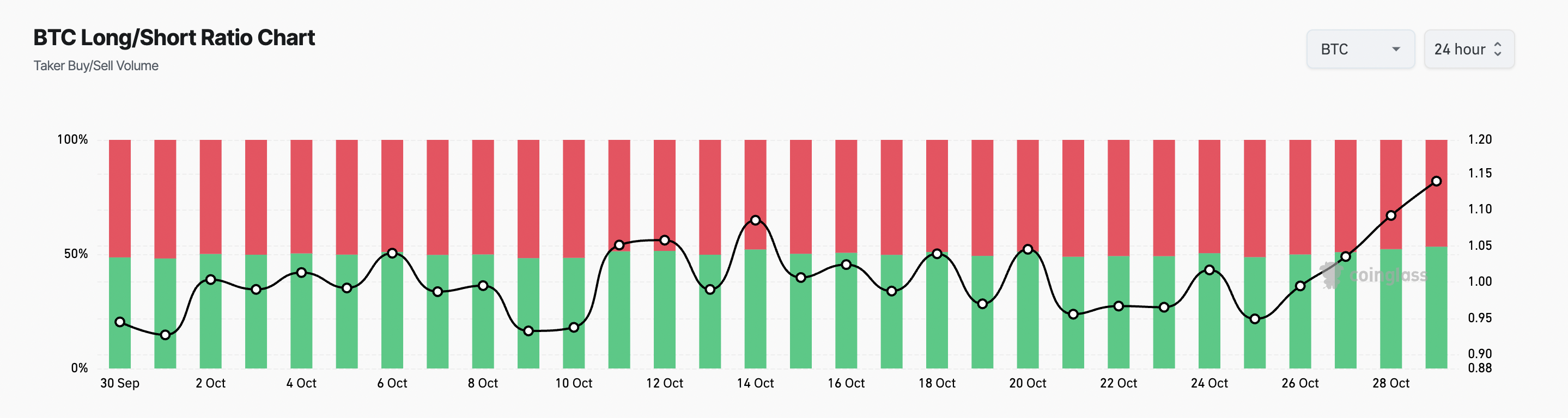 This is the case with Bitcoin, with more than half of the opened positions in its futures market betting on continued price growth. According to Coinglass, the BTC long/short ratio has reached a monthly high, with over 50% of the volume now dominated by long positions.