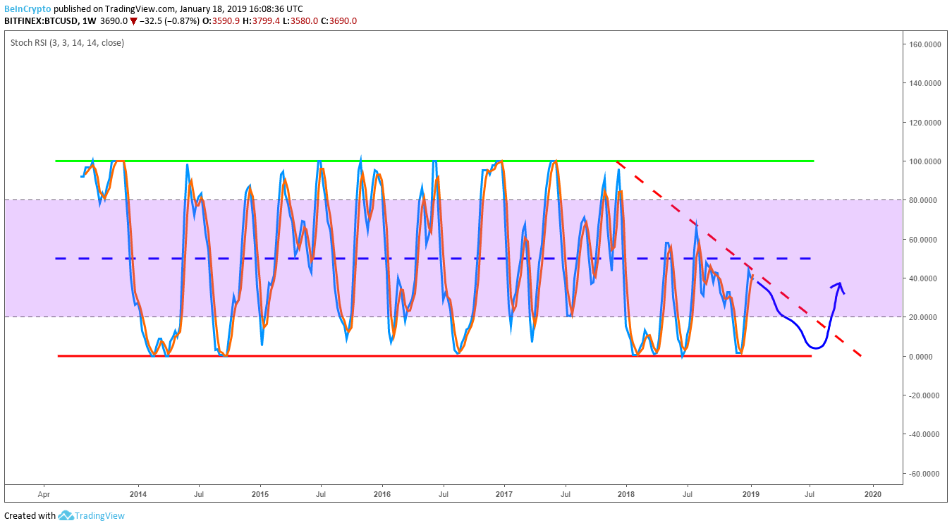 Taking a look at the stochastic relative strength index (RSI), Bitcoin looks to be approaching a heavy descending resistance which began after falling from its peak of nearly $20,000 in December of 2017.
