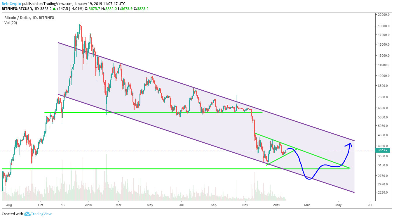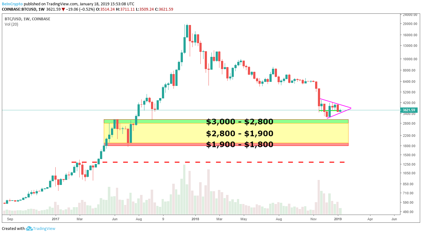 If Bitcoin follows the pennant formation on the weekly chart, the price does have the potential to regain some ground in the neighborhood of $4,000 before making a breakout in either direction.