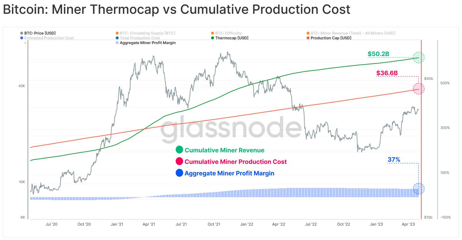 Furthermore, the cumulative miner production cost is $36.6 billion, according to Glassnode. This means that there is an all-time-aggregate profit margin for Bitcoin miners at $13.6 billion. As a percentage, this works out at 37%, making BTC mining a highly profitable venture over the years.