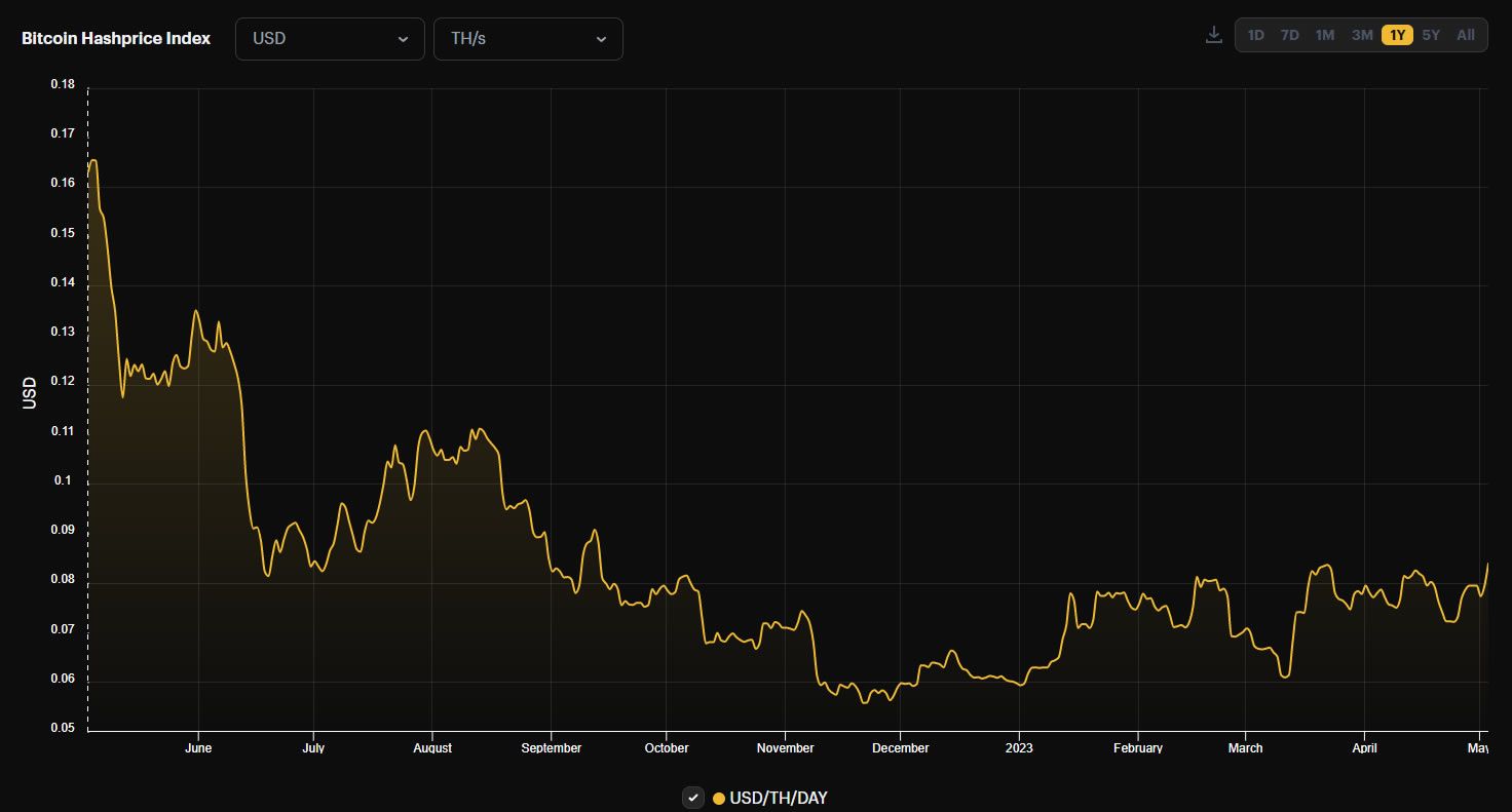 The current hash price, which is calculated in dollars per terahash per second per day, is $0.083 as of May 2. The good news is that it is climbing and has gained 50% since its low of $0.055 in November 2022.