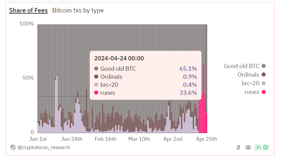 However, as the initial excitement around Runes waned, congestion and fees decreased. Data from Dune Analytics shows that Runes transactions had fallen to 33.6% by April 24. Rune transactions previously accounted for 69.5% of all transaction fees on halving day.