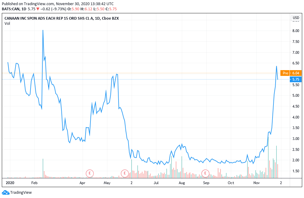 Canaan’s stock price is up over 170% so far in Q4 2020. Since September, the company’s share price has risen two-fold but is still some way off its Nov. 2019 all-time high (ATH).