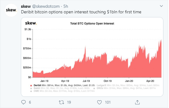One month ago, there were just $10.4 million worth of open options at the exchange. Today, Skew reports $174 million in open interest in the derivative products.