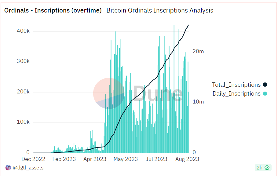 According to Dune analytics data, the number of inscriptions on Bitcoin is now more than 25 million — reaching a daily all-time high of 422,164 on July 30. Ordinals Inscriptions are similar to NFTs that can be inscribed into the smallest denomination of a Bitcoin, Satoshi.