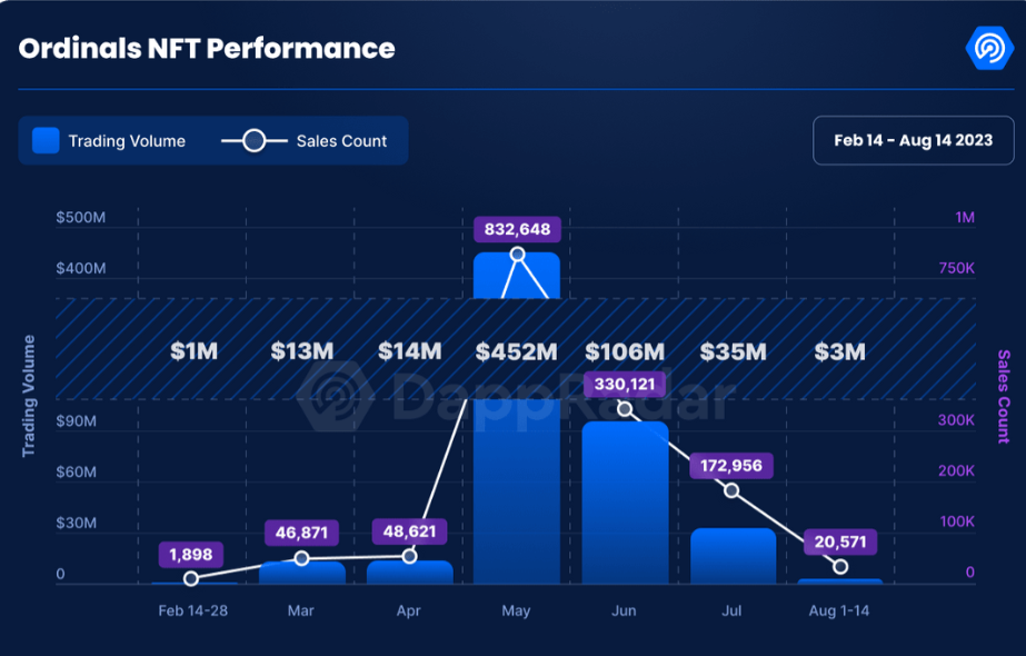 Meanwhile, DappRadar reported that Ordinals trading volume and sales count have fallen by more than 97% since May. The number of unique active wallets trading Bitcoin Ordinals has also decreased by 90%.