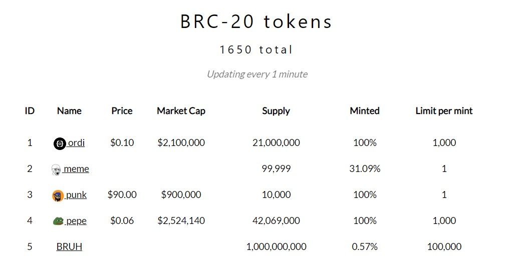 Data by BRC-20.io reveals that 38,715 tokens were minted in the last 24 hours. Since its inception, the full list of BRC-20 tokens has climbed to 1,650.