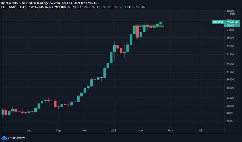 Yesterday, bitcoin (BTC) reached its highest-ever weekly close slightly above $60,000. Today it reached a new high of $62,750 after a month of trading below $60,000.