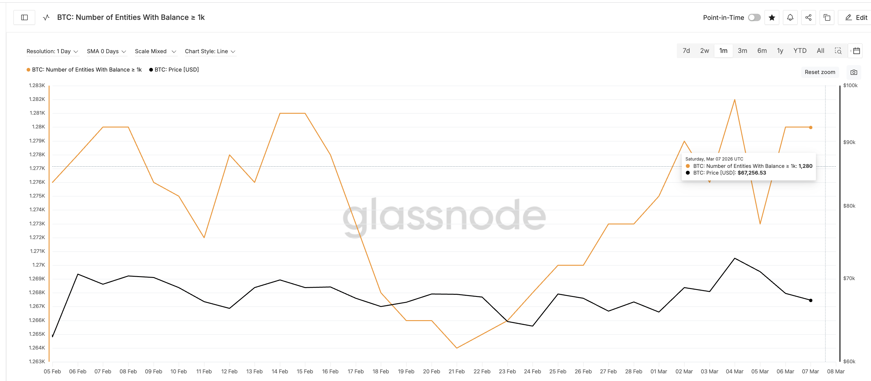 The number of Bitcoin entities holding at least 1,000 BTC has gradually increased since February 21. During that period, the count rose from 1,264 addresses to around 1,280, approaching the highest levels seen, month-on-month.