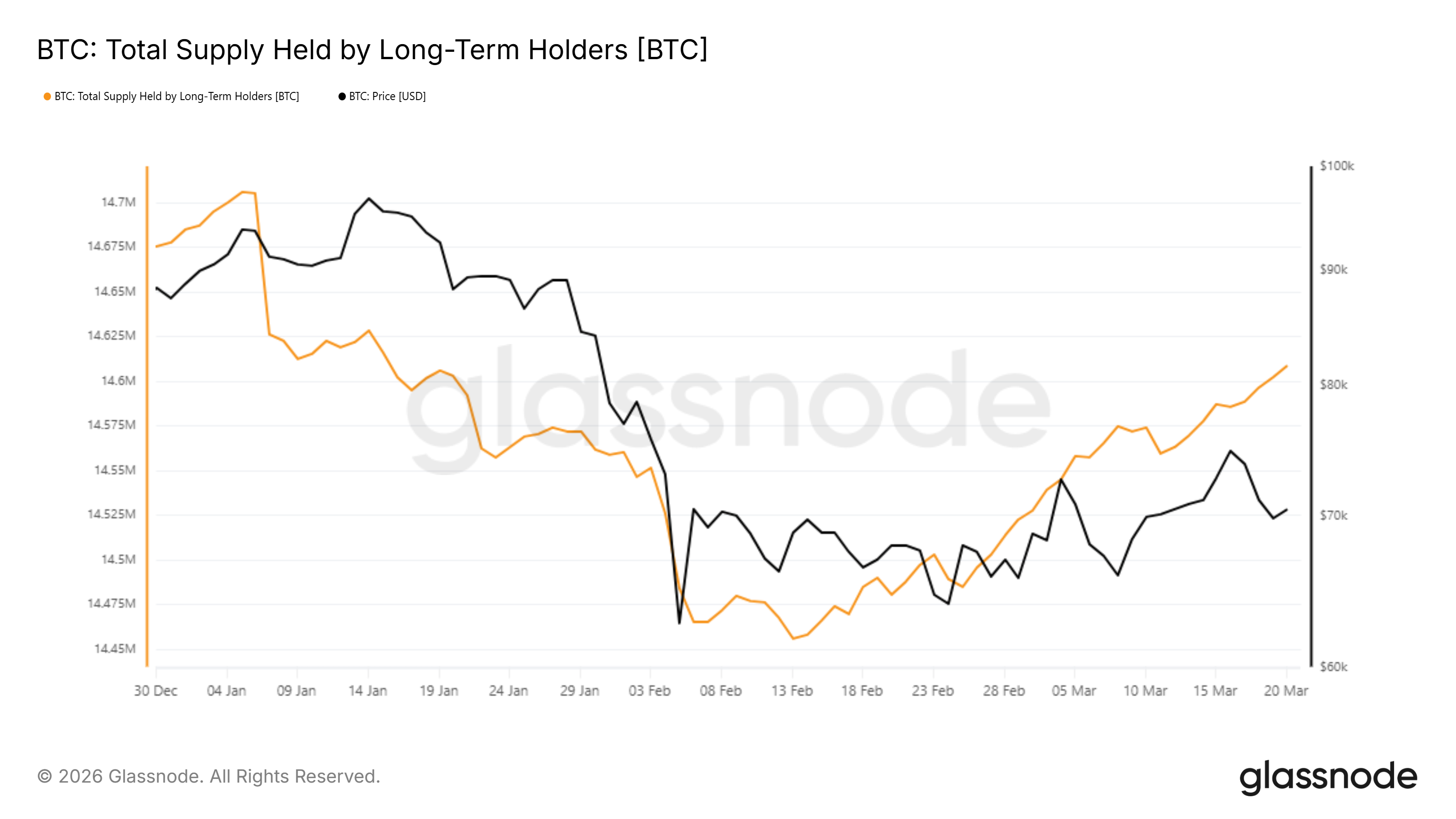 Since then, LTH supply has climbed steadily to approximately 14.61 million BTC as of March 20 — a net addition of roughly 150,000 BTC over six weeks.