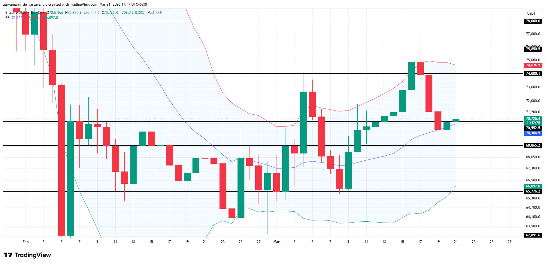 Bitcoin price reached a high of $75,850 on March 17 before a two-candle rejection brought it back below $74,000. That level is now confirmed resistance. Below the current price, the first visible support is $68,865, followed by the lower Bollinger Band at $66,097 and the deeper floor at $62,891.