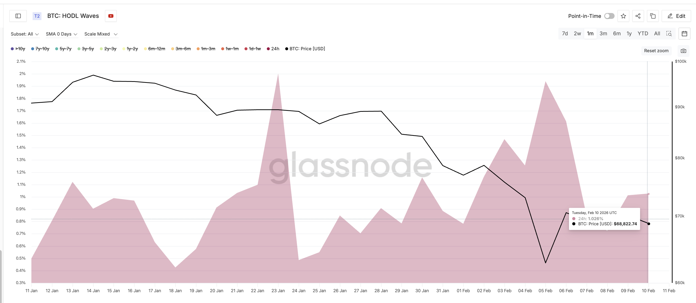 When both medium-term buy and very long-term investors sell, the downside risk increases. HODL Waves confirm this shift. This metric shows how supply is distributed by holding time. The 24-hour cohort represents very short-term traders who tend to react emotionally to price moves.