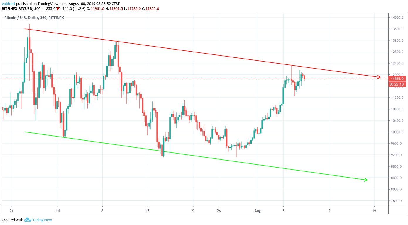 On August 6, 2019, the Bitcoin price reached a high of $12,325. A sharp decrease followed. BTC reached a low of $11,249 the next day. It has been increasing since. The highest price that has been reached was $12,153.