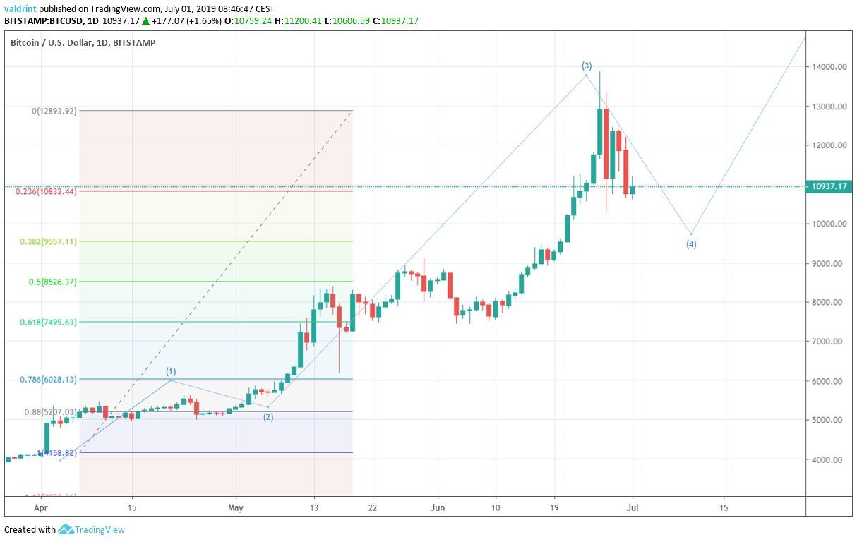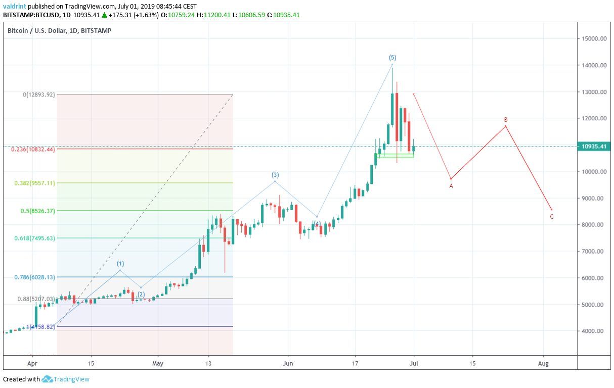 According to our analysis, the price of BTC is likely in a correction, either a short one as a part of wave 4 or a longer A-B-C correction.