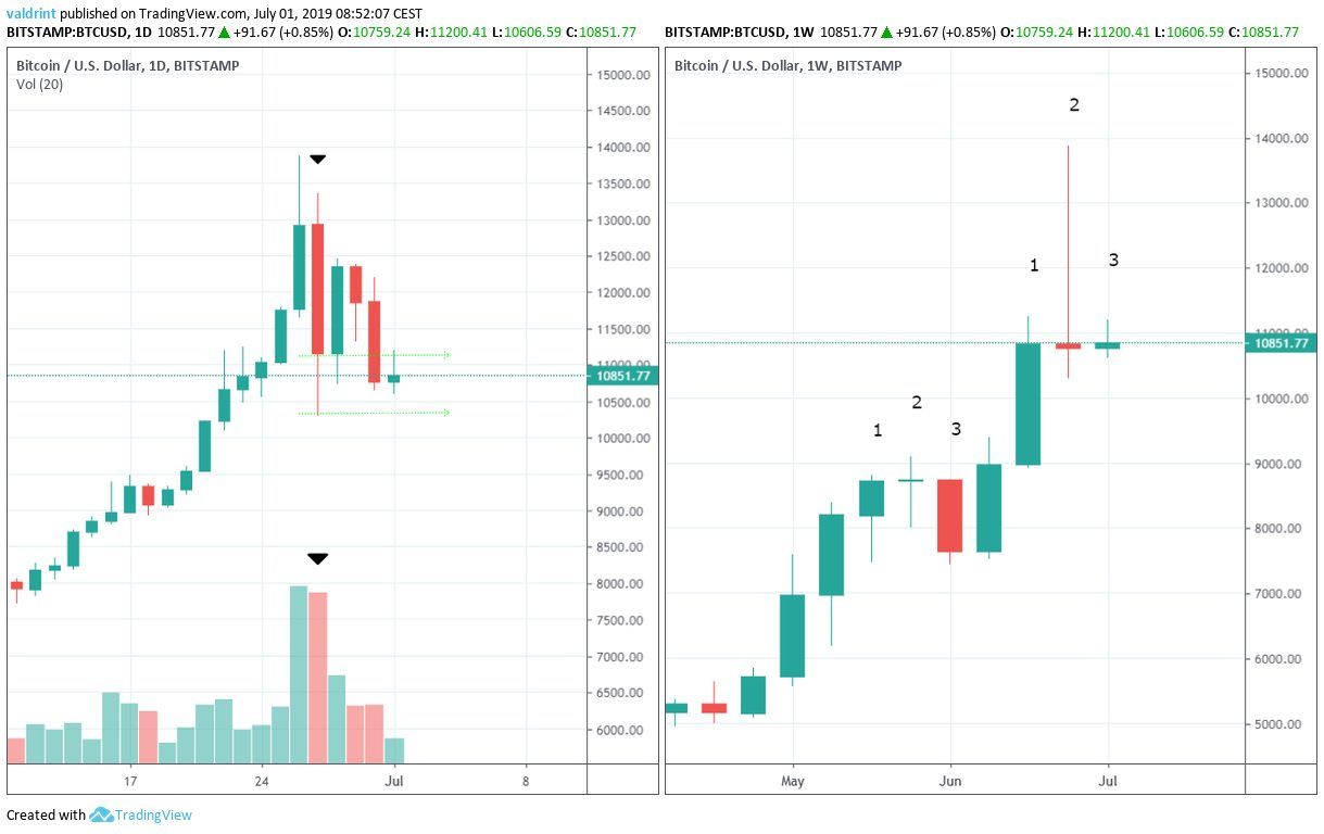 After reaching a high of close to $14,000 on June 26, the Bitcoin price immediately decreased and closed near $13,000.
