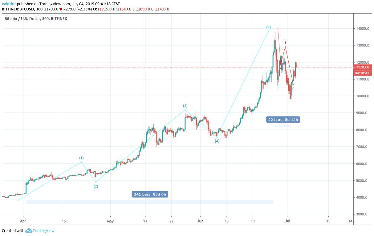 On June 26, 2019, the Bitcoin price reached a high of $13,764. It has been decreasing since. BTC/USD is likely in a correction. Today, we are going to analyze two possible patterns this correction might take.