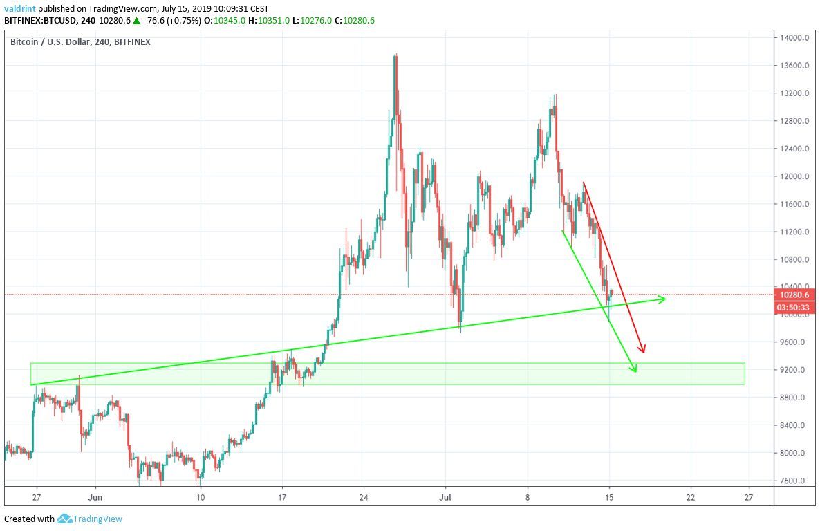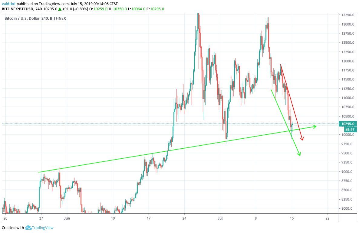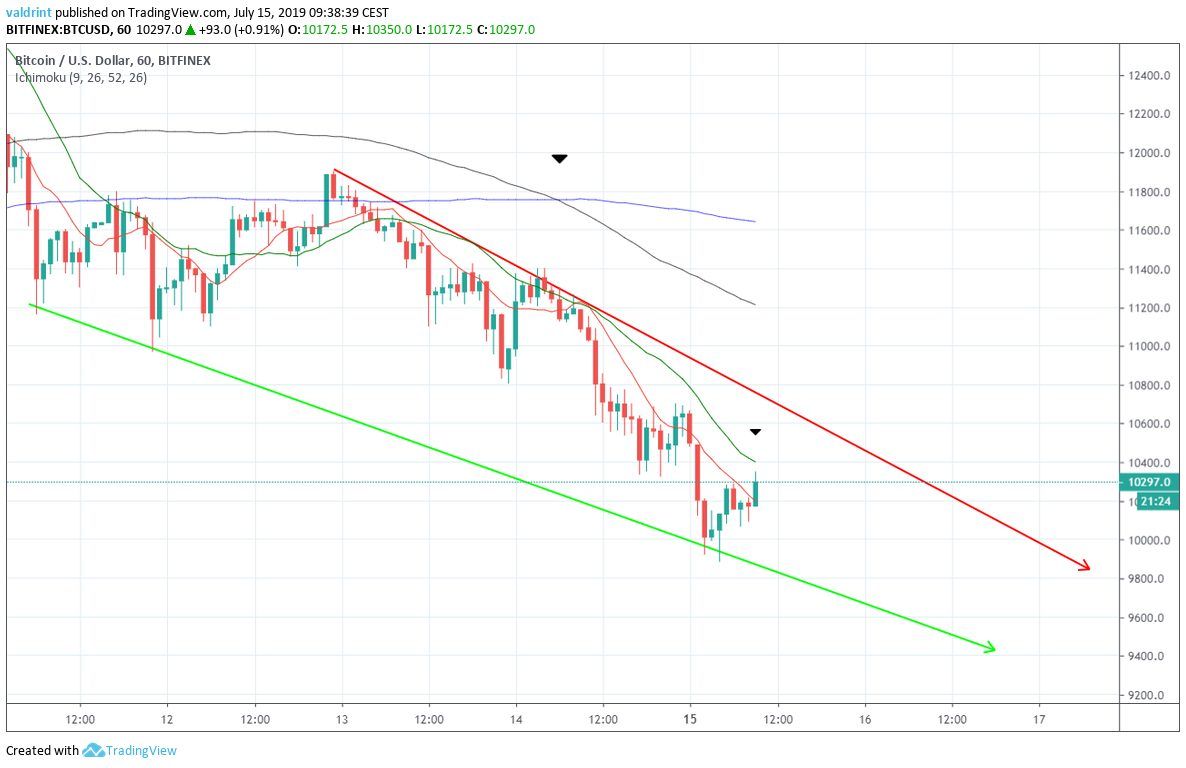 On June 26, 2019, the Bitcoin price reached a high of $13,764. A decrease ensued. On July 2, the BTC price reached a low of $9728. After a failed upward move, it created a lower high on July 10 — before continuing its downward move.