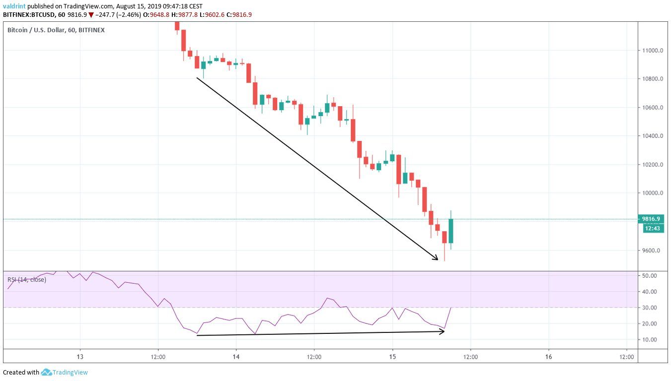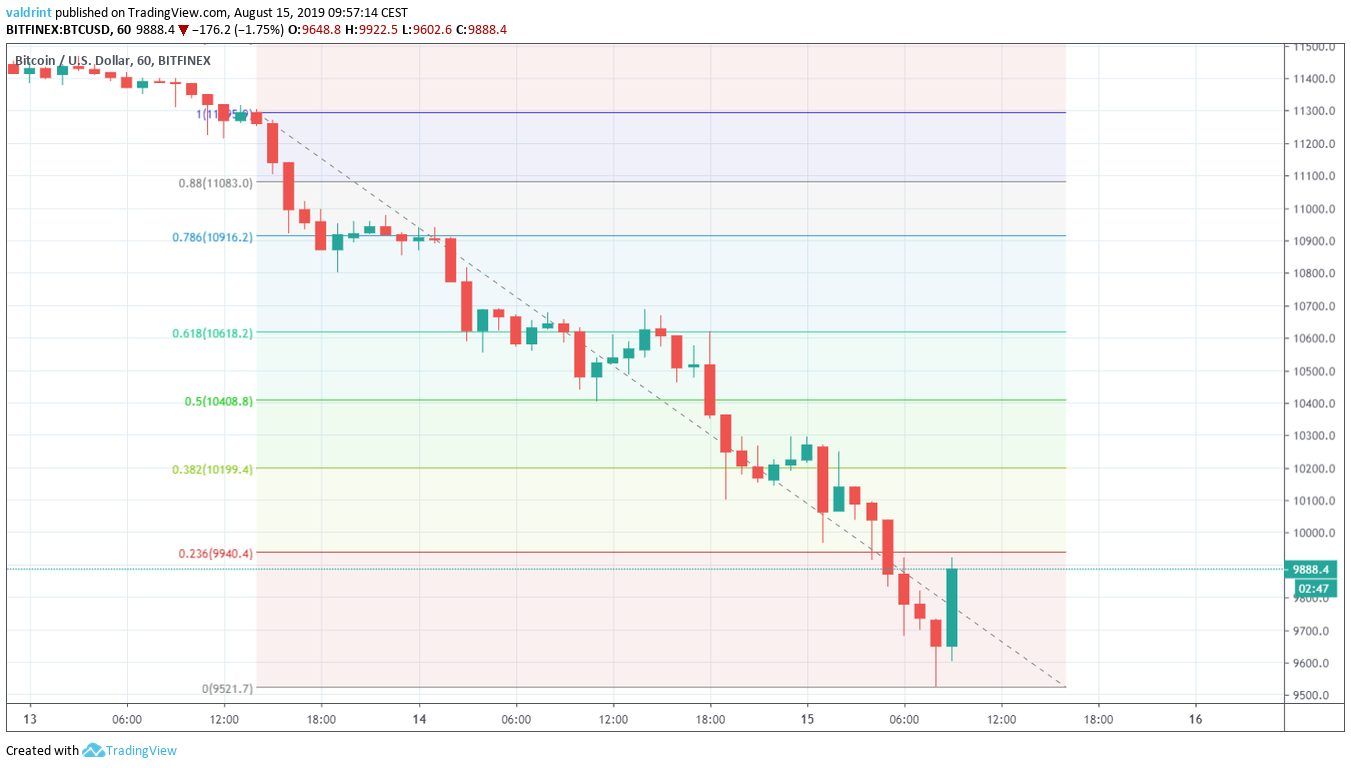 On August 12, 2019, the Bitcoin price reached a high of $11,615. The next day, a rapid decrease began that is still ongoing. The BTC price briefly found support above $10,400 before continuing the downward move.