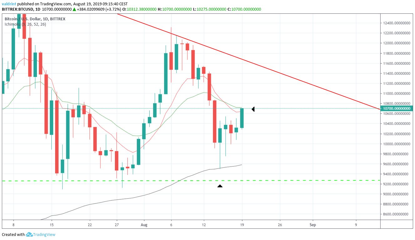 On August 10, 2019, the Bitcoin price reached a high of $12,011. A rapid decrease ensued. The BTC price traded around $11,400 until August 13, when another rapid decrease began. On August 15, it reached a low of $9522. It has been increasing since then.