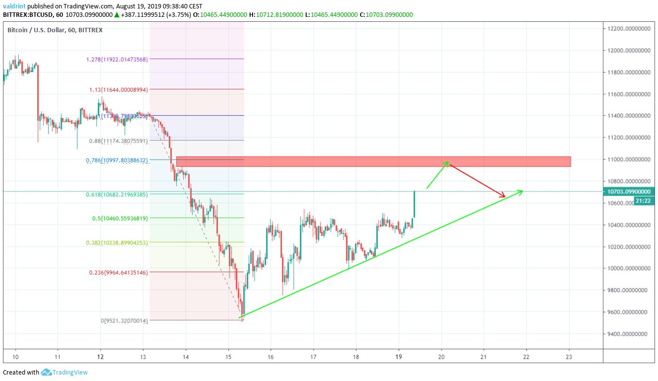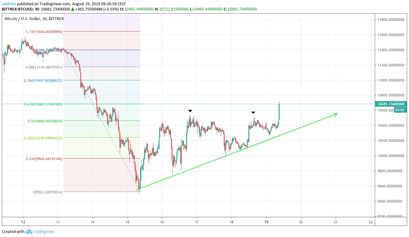 A look at the 30-minute chart shows that BTC has been following an ascending support line since reaching lows near $9500 on August 15.