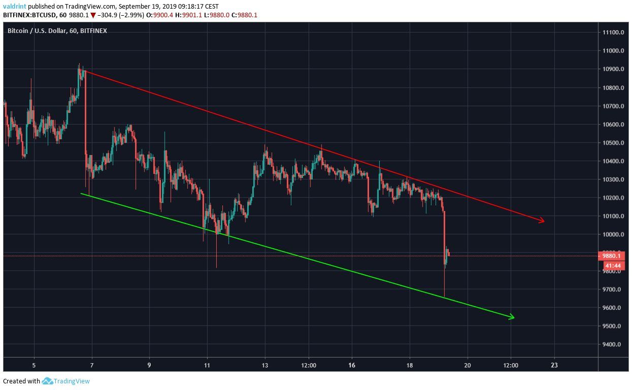 The breakout was swift and the price reached a low of $9671 before increasing slightly.