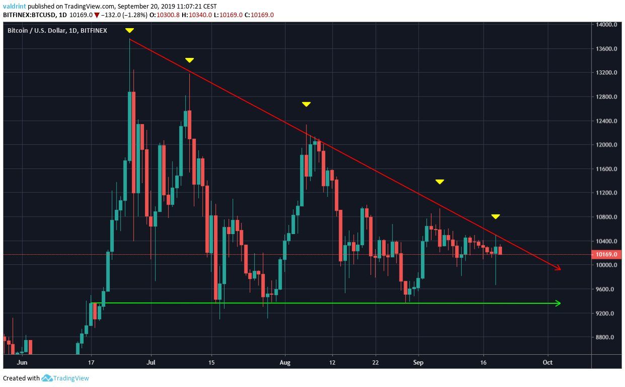 A look at the daily chart shows that BTC has been trading inside a descending triangle.