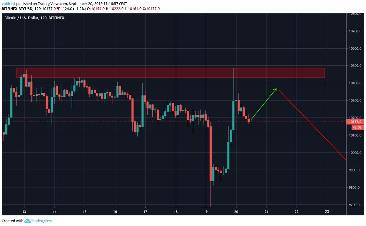 On September 18, 2019, the Bitcoin price reached a high of $10,276. A rapid decrease ensued and BTC reached a low of $9655 the next day. However, it immediately reversed and reached a high of $10,487 on September 19. It has been decreasing since.