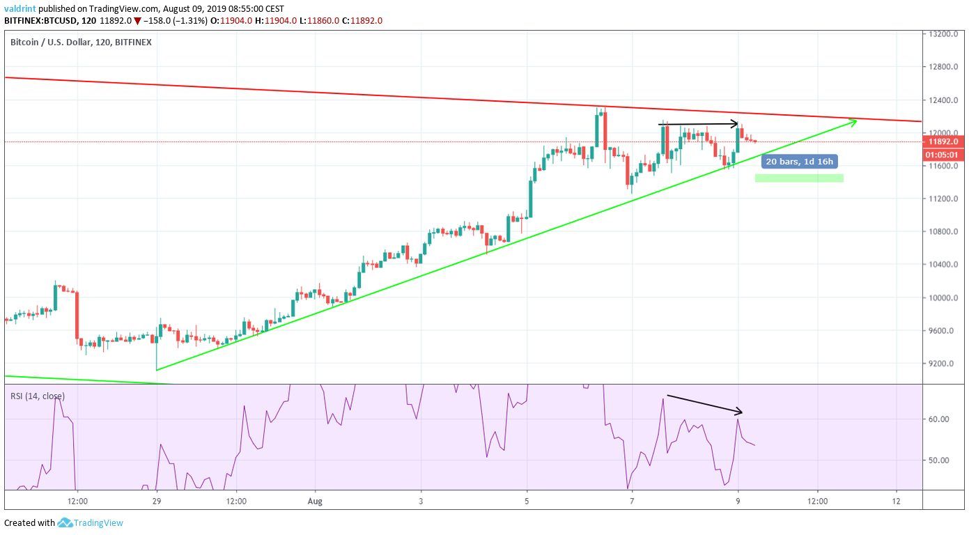A look at the two-hour time-frame shows that the Bitcoin price has been following an ascending support line, which when combined with the resistance from the channel, creates a symmetrical triangle.